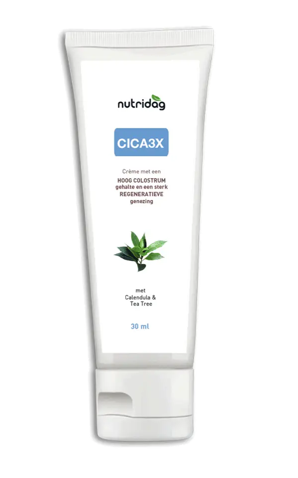 CICA3X is een herstellende herstellende crème met een hoog gehalte aan Colostrum (20%) met extracten van echinacea, grapefruitzaden, calendula en essentiële oliën van lavendel en tea tree.