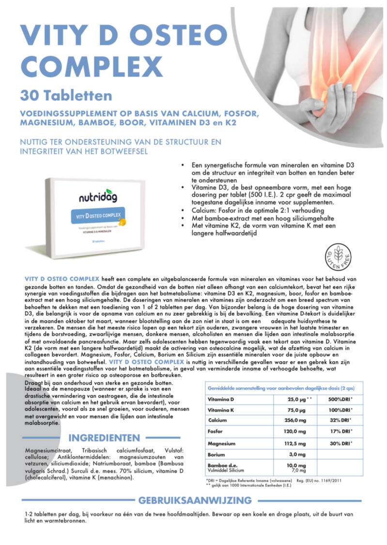 Vitamine K2 (de vorm met een langere halfwaardetijd) maakt de activering van osteocalcine mogelijk, wat de afzetting van calcium in collageen bevordert. Magnesium, Fosfor, Calcium, Borium en Silicium zijn essentiële mineralen voor de juiste opbouw en instandhouding van botweefsel. VITY D OSTEO COMPLEX is nuttig in verschillende gevallen waar er een gebrek kan zijn aan essentiële voedingsstoffen voor het botmetabolisme, in geval van verminderde inname of verhoogde behoefte, wat resulteert in een groter risico op osteoporose en botbreuken.
