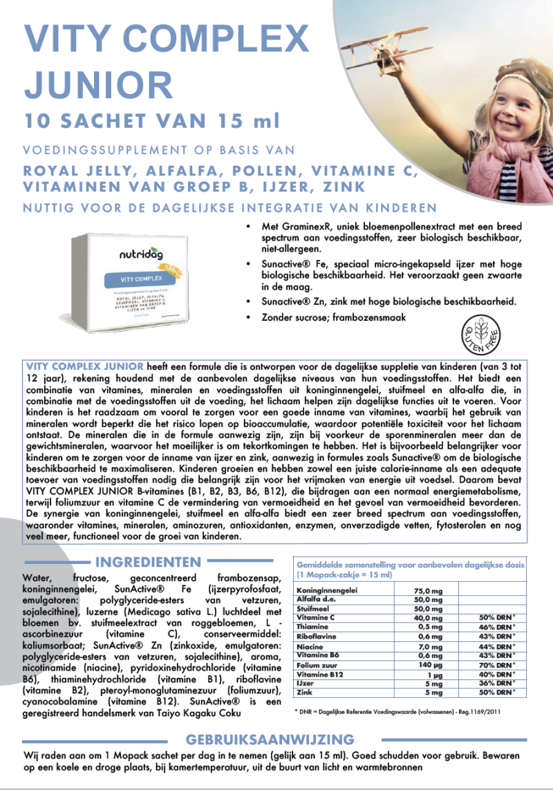 VITY COMPLEX JUNIOR heeft een formule die is ontworpen voor de dagelijkse suppletie van kinderen (van 3 tot 12 jaar), rekening houdend met de aanbevolen dagelijkse niveaus van hun voedingsstoffen. Het biedt een combinatie van vitamines, mineralen en voedingsstoffen uit koninginnengelei, stuifmeel en alfa-alfa die, in combinatie met de voedingsstoffen uit de voeding, het lichaam helpen zijn dagelijkse functies uit te voeren. Voor kinderen is het raadzaam om vooral te zorgen voor een goede inname van vitamines, waarbij het gebruik van mineralen wordt beperkt die het risico lopen op bioaccumulatie, waardoor potentiële toxiciteit voor het lichaam ontstaat. De mineralen die in de formule aanwezig zijn, zijn bij voorkeur de sporenmineralen meer dan de gewichtsmineralen, waarvoor het moeilijker is om tekortkomingen te hebben. Het is bijvoorbeeld belangrijker voor kinderen om te zorgen voor de inname van ijzer en zink, aanwezig in formules zoals Sunactive® om de biologische beschikbaarheid te maximaliseren. Kinderen groeien en hebben zowel een juiste calorie-inname als een adequate toevoer van voedingsstoffen nodig die belangrijk zijn voor het vrijmaken van energie uit voedsel. Daarom bevat VITY COMPLEX JUNIOR B-vitamines (B1, B2, B3, B6, B12), die bijdragen aan een normaal energiemetabolisme, terwijl foliumzuur en vitamine C de vermindering van vermoeidheid en het gevoel van vermoeidheid bevorderen. De synergie van koninginnengelei, stuifmeel en alfa-alfa biedt een zeer breed spectrum aan voedingsstoffen, waaronder vitamines, mineralen, aminozuren, antioxidanten, enzymen, onverzadigde vetten, fytosterolen en nog veel meer, functioneel voor de groei van kinderen.