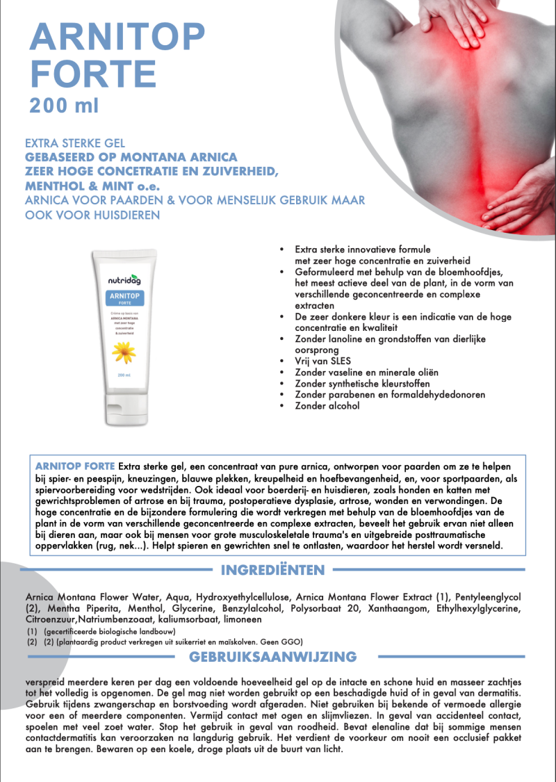 ARNITOP FORTE Extra sterke gel, een concentraat van pure arnica, ontworpen voor paarden om ze te helpen bij spier- en peespijn, kneuzingen, blauwe plekken, kreupelheid en hoefbevangenheid, en, voor sportpaarden, als spiervoorbereiding voor wedstrijden. Ook ideaal voor boerderij- en huisdieren, zoals honden en katten met gewrichtsproblemen of artrose en bij trauma, postoperatieve dysplasie, artrose, wonden en verwondingen. De hoge concentratie en de bijzondere formulering die wordt verkregen met behulp van de bloemhoofdjes van de plant in de vorm van verschillende geconcentreerde en complexe extracten, beveelt het gebruik ervan niet alleen bij dieren aan, maar ook bij mensen voor grote musculoskeletale trauma's en uitgebreide posttraumatische oppervlakken (rug, nek...). Helpt spieren en gewrichten snel te ontlasten, waardoor het herstel wordt versneld.